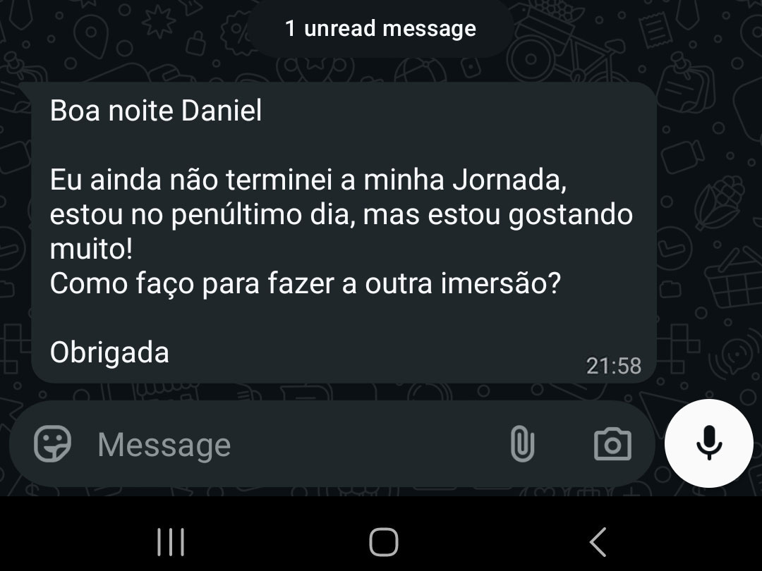 Se por qualquer motivo você sentir que não é o seu momento ou que a nossa Imersão não é para você, basta nos enviar um e-mail ou mensagem pelo WhatsApp.